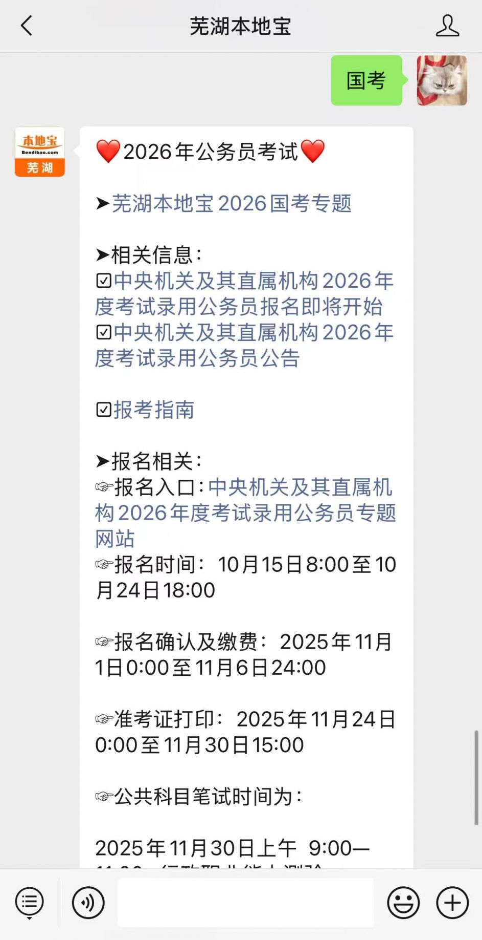 温馨提示:微信搜索公众号【芜湖本地宝】,关注后对话框回复【国考】可获2026年度国考报名时间/入口/报名情况/考点/考试安排/岗位职位表等。